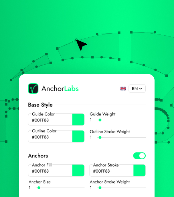 AnchorLabs is a precision tool for designers who care about clean logo construction. Easily overlay anchors, Bezier handles, outlines and optional baseline/angle guides on any vector selection in Figma.